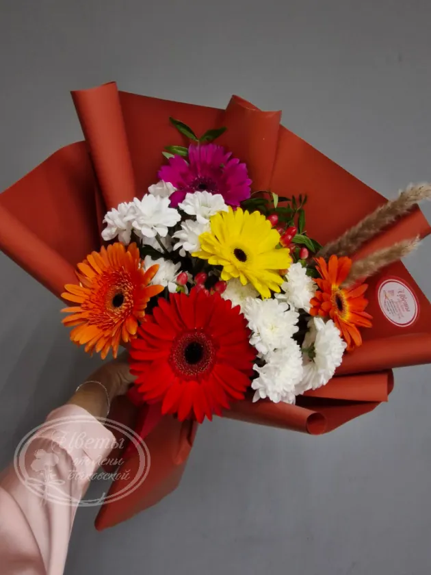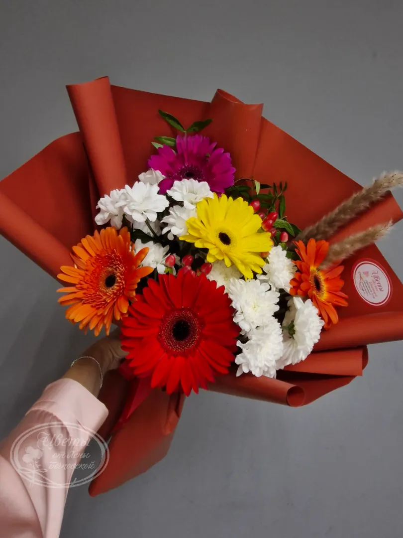 Букет «Осенний блюз» сочетает яркие герберы и нежные кустовые хризантемы, создавая теплую палитру увядающей природы. Писташ добавляет глубину и объем, дополняя композицию мягкими зелеными оттенками. Воздушные метелки кортадерии придают букету легкость и природную динамику. Теплые тона гербер перекликаются с пастельными хризантемами, напоминая осенний закат. Этот букет словно вобрал в себя все оттенки осени — от солнечного золота до приглушенного зелени. Композиция идеально подойдет для подарка, наполненного уютом и теплом. «Осенний блюз» — это гармония красок и эмоций в душевном букете.Купить букет гербер очень легко- просто позвоните или напишите нам