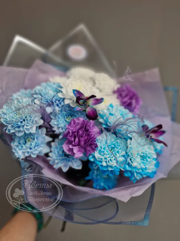 Букет «Голубая лагуна» завораживает своей утонченностью и необычной цветовой гаммой. В его состав входят изящные хризантемы, которые добавляют объём и изящество. Аккуратные цветы дендробиум придают композиции изысканную тропическую нотку. Мягкие диантусы создают нежное пастельное настроение и дополняют основной ансамбль. Глубокие оттенки голубого и сирени в сочетании с белыми цветами создают эффект спокойствия и свежести. Этот букет отлично подойдет для романтических и праздничных мероприятий. Он идеально подчеркнёт вашу индивидуальность и хорошее настроение. «Голубая лагуна» станет прекрасным подарком для ценителей красоты и элегантности.