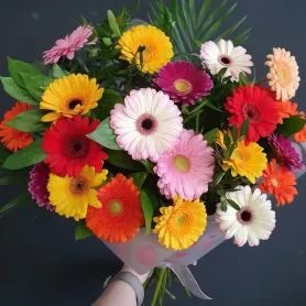 Яркий букет из потрясающих гербер, зелени в корейской пленке, самый приятный подарок на любой случай!