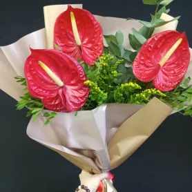 Букет из антуриума в корейской пленке с эвкалиптом,солидаго и фисташкой