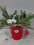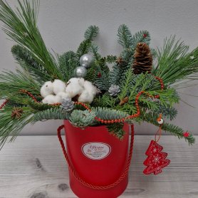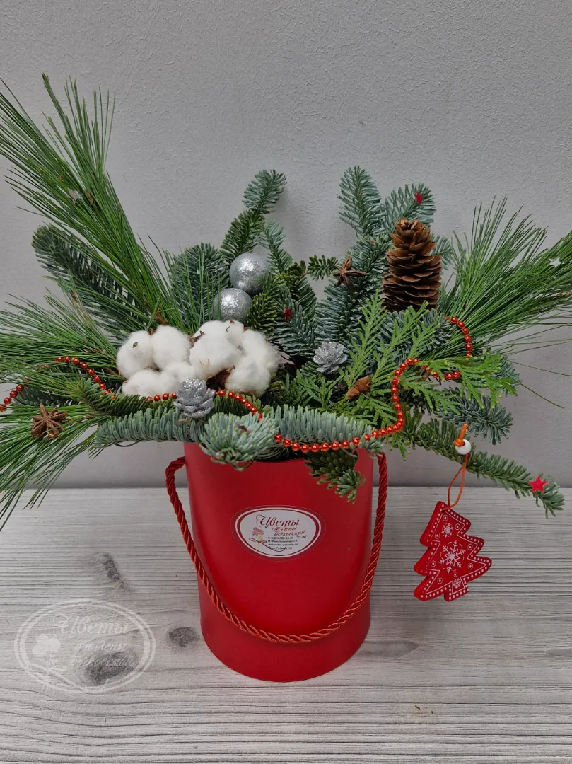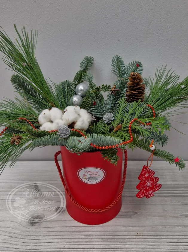 Красная композиция с разными хвойными creates яркое и праздничное настроение. В ее состав входят элегантные Нобилис и пышные ветки Пинус, создавая гармоничное сочетание. Этот букет идеально подойдет для украшения интерьера или подарка к особому событию.