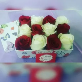 Дуэт красных и белых роз в подарочной коробочке.