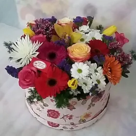 Шляпная коробка с ярким цветочным наполнением.