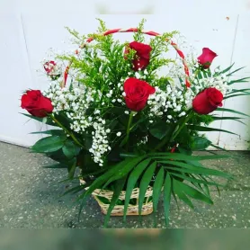 Корзинка с красными розами и зеленью.