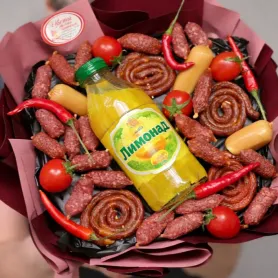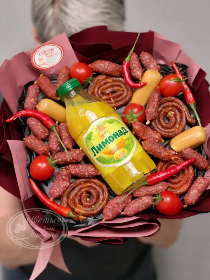 Букет «Колбасный VIP» — это яркое и необычное сочетание ароматных колбасных деликатесов, искусно объединённых в оригинальной композиции. Этот букет идеально подойдёт для ценителей отменных мясных продуктов и тех, кто ищет нестандартные подарки. В его составе представлены разнообразные сорта колбас: копчёные, варёные и сыроеспелые, аккуратно уложенные в эстетичную упаковку. Каждый элемент букета выполнен с вниманием к деталям, что подчеркивает высокий статус подарка. Такой букет отлично впишется в любой праздник, будь то день рождения или особый торжественный случай. Он обязательно вызовет интерес и улыбку у получателя благодаря своей оригинальной концепции. «Колбасный VIP» — это не просто вкусный подарок, а настоящее выражение уважения и внимания. Такой букет оставит яркое впечатление и надолго запомнится своим необычным стилем.