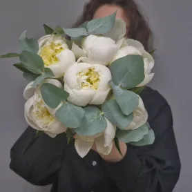 Популярный букет нквесты в классическом стиле из пионов и эвкалипта